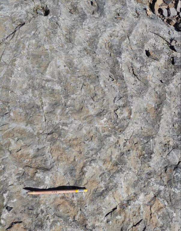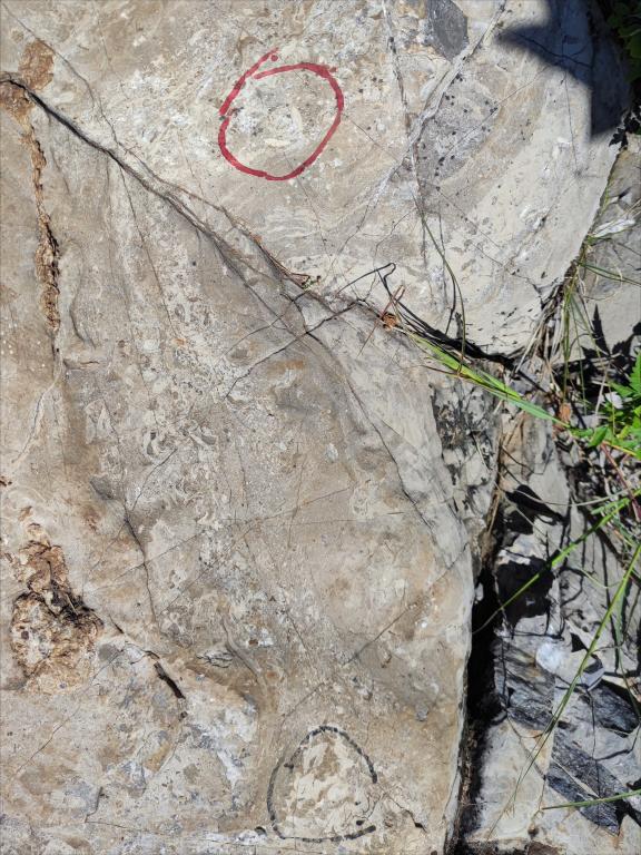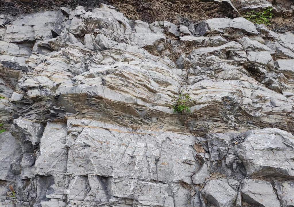 来到今天第二个观测点:大剖面下方。观察描述冶里组地层灰岩岩性:以灰色砾屑灰岩为主,其次为深灰色薄层泥质条带灰岩,夹有黄绿色页岩。
