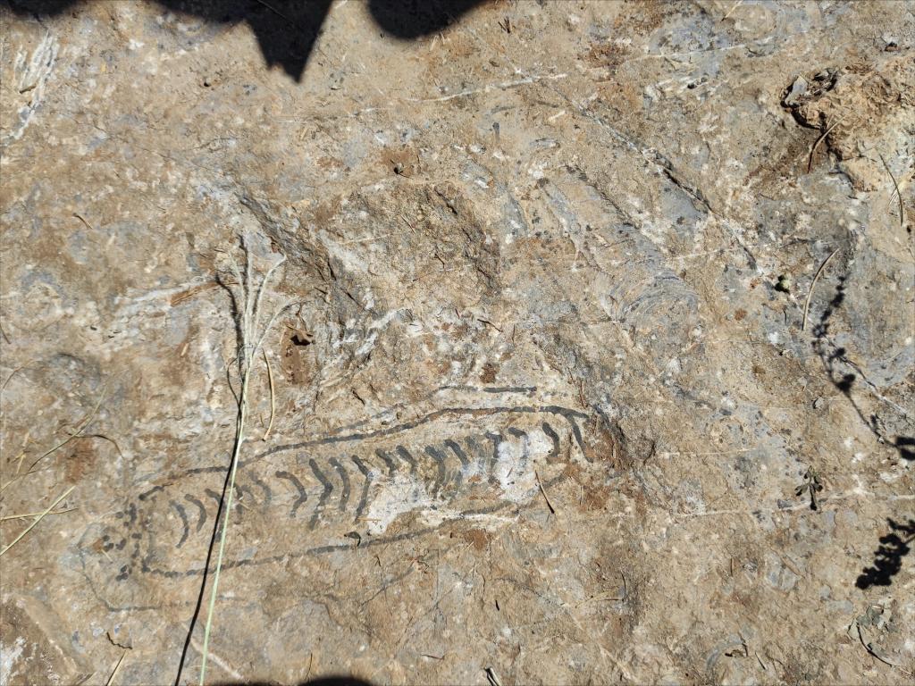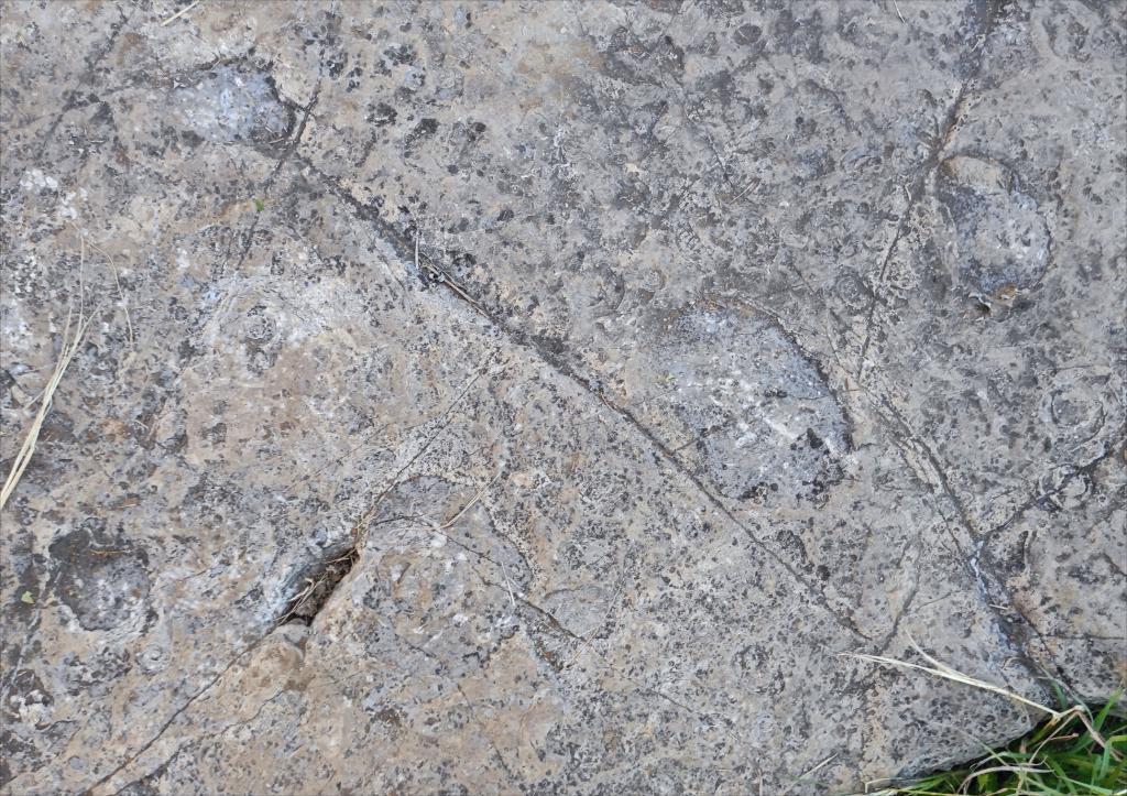来到今天第七个观测点:亮甲山山坡。观察化石,亮甲山上的化石在风化面上显露,可看到藻类化石、蛇卷螺化石和角石化石。
