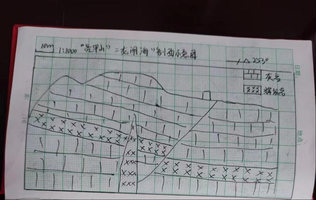 谢老师介绍此处灰岩属于海相沉积地层在海洋的200m深度沉积了大量灰岩,后期在一次岩浆活动作用下,岩浆侵入到岩层之间形成了一个岩床,又过了好长时间,又一次的岩浆活动,岩浆沿着地层之间的裂隙侵入,冲断了岩床从而形成了一个穿插岩床而过的岩墙。抬头看向亮甲山,两个非常醒目的墨绿色侵入体,一个顺层侵位到亮甲山组内部为岩床,一个以岩墙方式贯入冶里组和亮甲山组之中。谢老师戏称这里为“二龙闹海”。在这,谢老师教授学生绘制亮甲山“二龙闹海”剖面示意图。