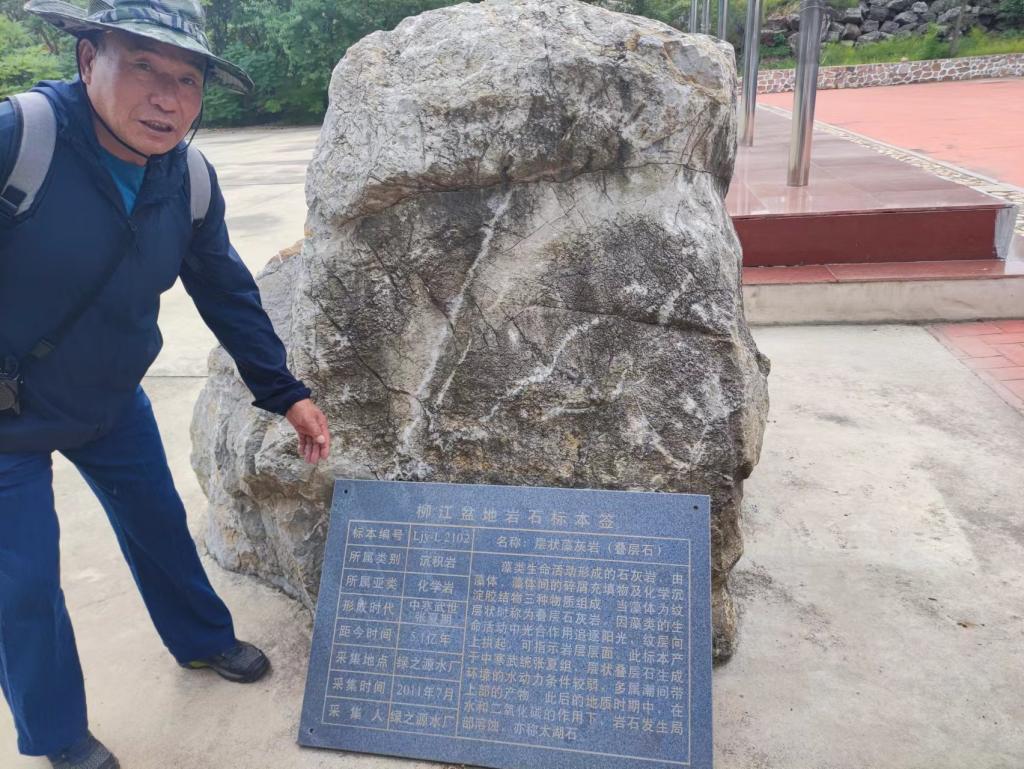 来到今天第一个地质观测点:山羊寨以东台阶上。该点为构造点,可见直立岩层,为亮甲山组黄斑豹皮灰岩,可见溶洞和洪积扇。