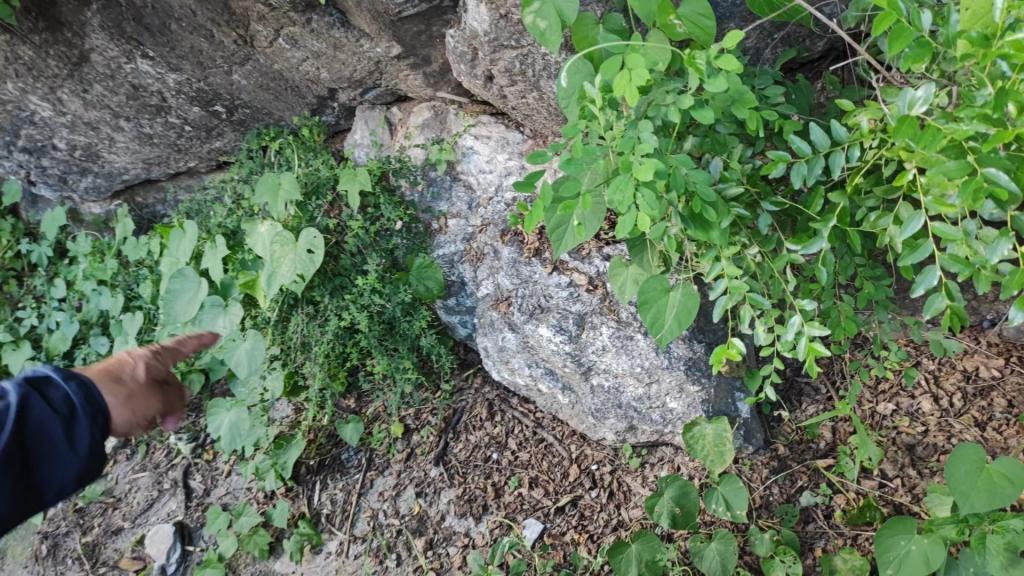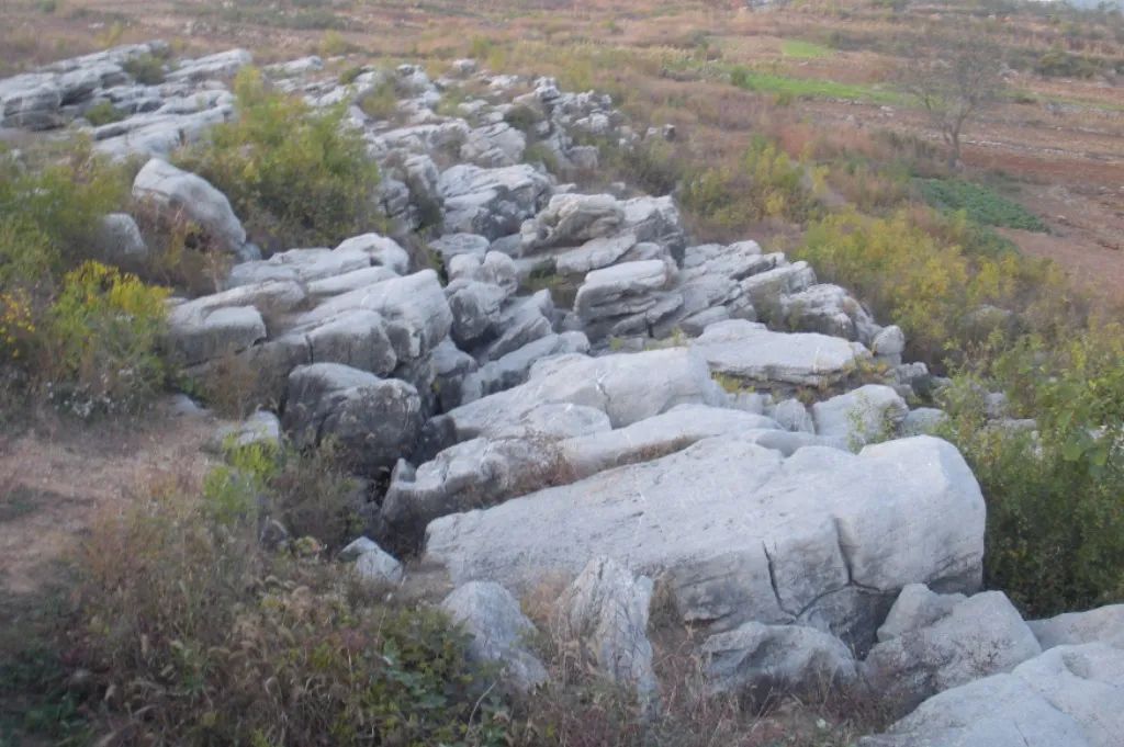 来到今天第四个地质观测点:距潮水峪东山坡西100m。此处为崮山组与长山组的分界点,长山组为大竹叶状砾屑灰岩,崮山组为紫色带氧化圈的竹叶状灰岩。
