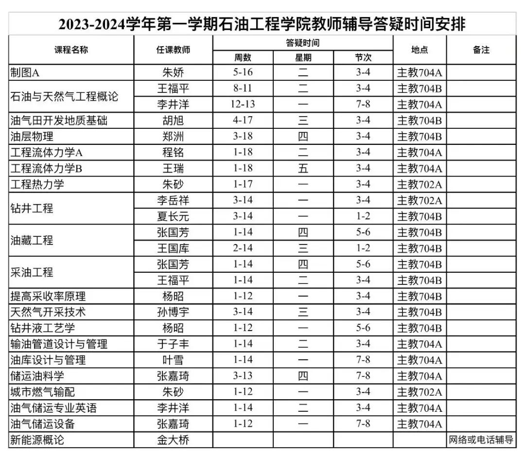 石油工程学院所有任课教师每学期均承担所讲授课程(含必修课、选修课)的辅导答疑工作,现公布2023-2024学年第一学期课外辅导答疑安排。