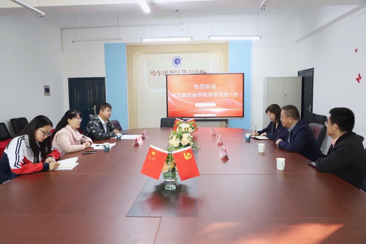 为深入贯彻党的二十大精神和习近平总书记关于教育的重要论述,坚持不懈用习近平新时代中国特色社会主义思想铸魂育人,落实《关于加快推进大中小学思政课一体化建设的若干意见》的相关要求,推进大中小学思政课一体化建设,切实发挥思想政治理论课立德树人关键课程作用,马克思主义学院院长吴卫东、副院长王瑞,石油工程学院党总支书记刘雁春一行赴哈尔滨新区第六学校进行思政课一体化交流共建活动,与哈尔滨新区第六学校党支部书记、校长范勇,党支部副书记李博针对两校思政课一体化共建进行探讨与交流。