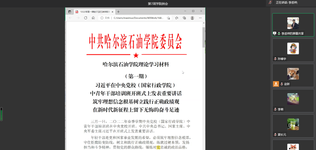 为提高教工党支部党员的思想政治教育能力和解决实际问题能力、更好的培养学生成长成才,石油工程学院教工党支部于4月19日组织党员进行线上集体学习,会议的主要内容是学习《习近平在中央党校(国家行政学院) 中青年干部培训班开班式上发表重要讲话》。会议由党支部书记李岳祥主持,学院全体教师党员参会。