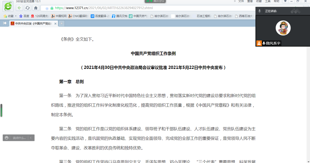 会议第二项由党支部组织委员孙博宇领学《中国共产党组织工作条例》。《中国共产党组织工作条例》一共七章四十六条,所有同志一起认真阅读学习后一致认为,《中国共产党组织工作条例》以习近平新时代中国特色社会主义思想为指导,贯彻落实新时代党的建设总要求,全面践行新时代党的组织路线,对党的组织工作作出全面规范,是做好新时代党的组织工作的基本遵循。