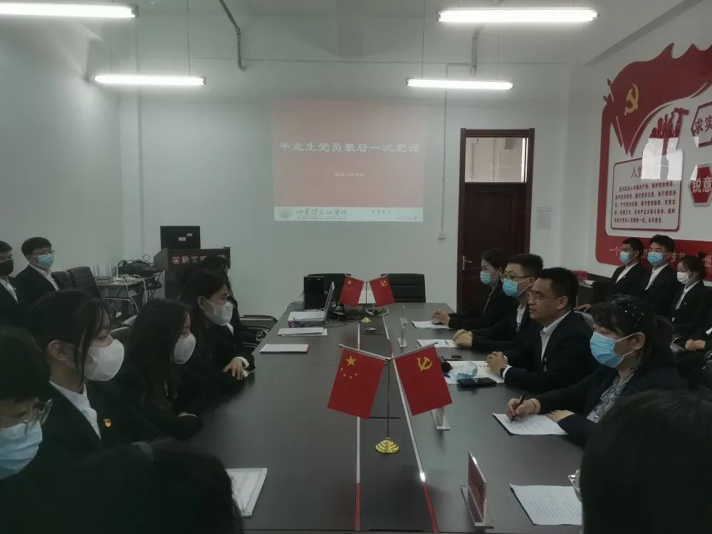 党课伊始,刘书记带领毕业生党员回顾了共产党的历史,围绕牢记党员身份、文明离校、把握就业机会、铭记师恩等方面为毕业生党员上了大学期间的最后一堂党课。他强调,党员同志要以实事求是的态度学好党史,领会我们党的光荣传统、宝贵经验和伟大成就。并寄语大家:“学生生涯虽已结束,但职业生涯才刚刚开启,在漫长的人生道路上,希望大家牢记入党誓词,不忘入党初心,通过理论学习坚定理想信念,以饱满的热情和昂扬的斗志投身于社会,在实践中增强党性修养,发挥党员的先锋模范作用。”