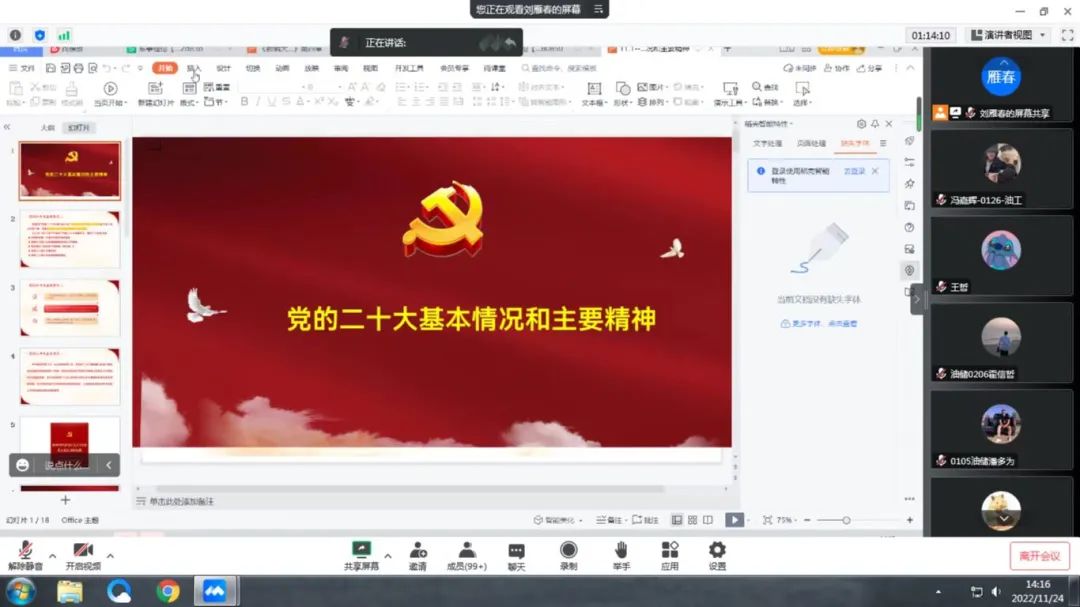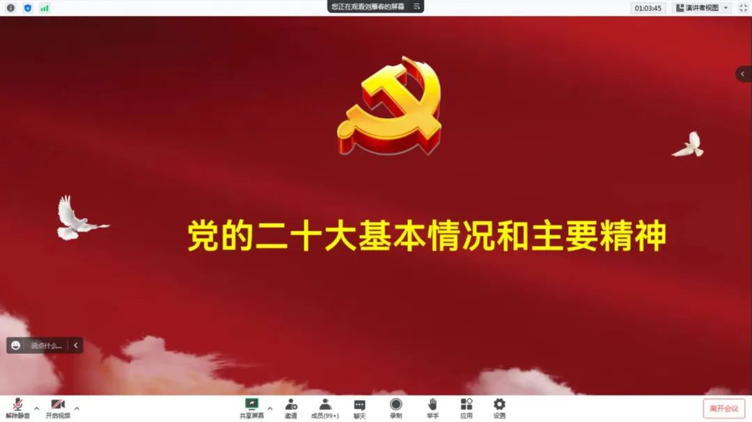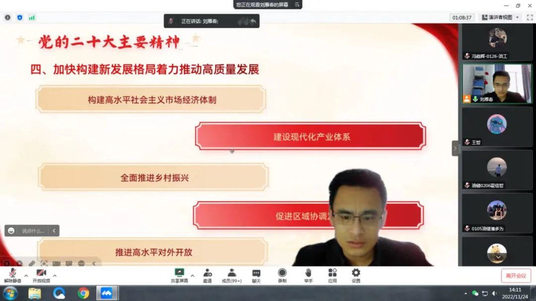 最后,刘书记希望同学们能在今后的课程中学会通过多种形式,活学活用党的二十大精神,教育同学们要听党话、跟党走,能具备爱党报国、敬业奉献、具有突出技术创新能力、善于解决复杂工程问题的复合型、战略性人才,通过注重个人成长、成才、成功与国家重大发展战略需求的统一,也更加需要战略人才聚焦解决世界经济、科技、健康等领域的热点难点问题,切实维护国家和世界的和平稳定,让青春在全面建设社会主义现代化国家的火热实践中绽放绚丽之花。