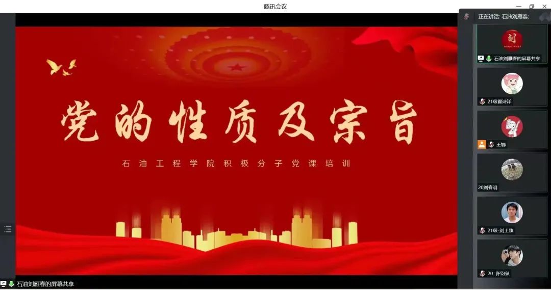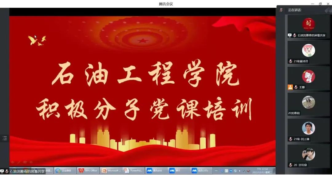 为深入贯彻落实党的二十大精神,端正党员发展对象入党动机,严把发展党员“入口关、质量关”。12月13日,我院于腾讯会议线上召开石油工程学院入党积极分子培训班开班仪式,开班仪式由学生党支部书记王娜主持,全体入党积极分子参会。