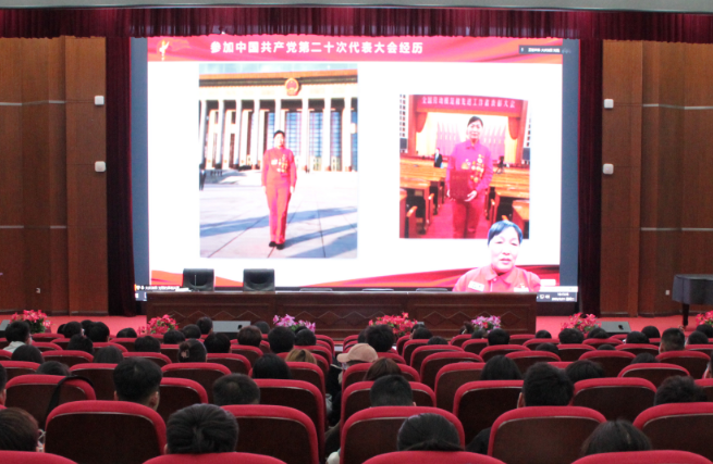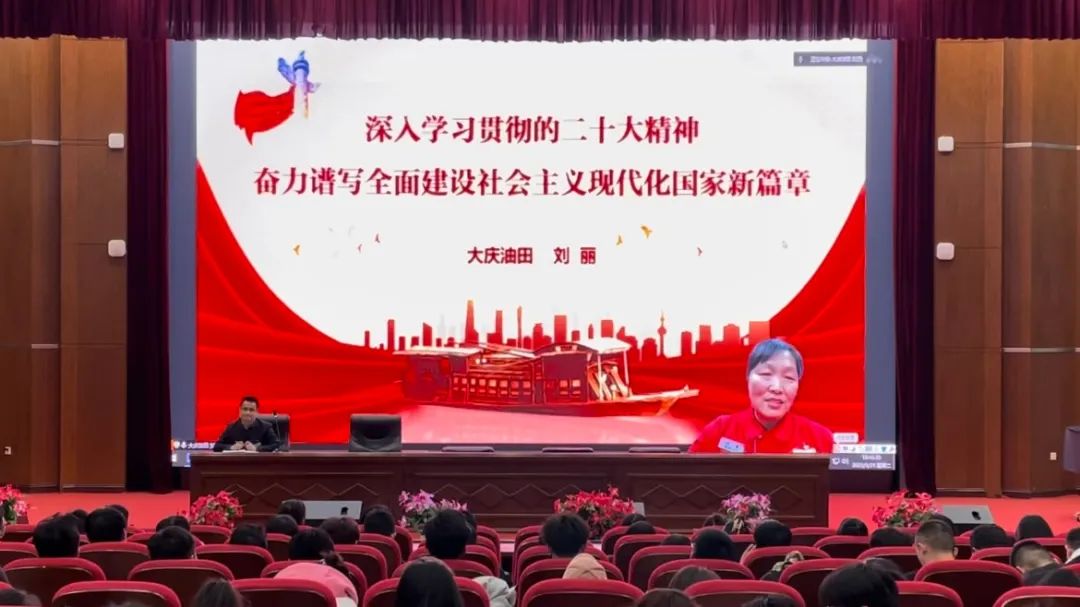 她为师生作了“深入学习贯彻党的二十大精神,奋力谱写全面建设社会主义现代化国家新篇章 ”主题宣讲。她的报告主要围绕党的二十大的主题、大会主要过程,以及过去五年的工作成果和新时代的伟大变革等方面进行,对党的二十大精神作了深入阐释。她希望广大石油学子能自觉对标党的二十大精神,主动从习近平总书记重要讲话和指示批示精神中找方向、找路子、找方法,进一步认清石油产业在龙江全面振兴全方位振兴发展中肩负的责任使命,科学把握新形势、新任务、新要求,坚持问题导向,强化责任担当,发挥好骨干作用,高质量高标准融入龙江建设中,为龙江全面振兴全方位振兴,为全面建设社会主义现代化国家、全面推进中华民族伟大复兴贡献石油力量,以实际行动拥护“两个确立”增强“四个意识”、坚定“四个自信”、做到“两个维护”