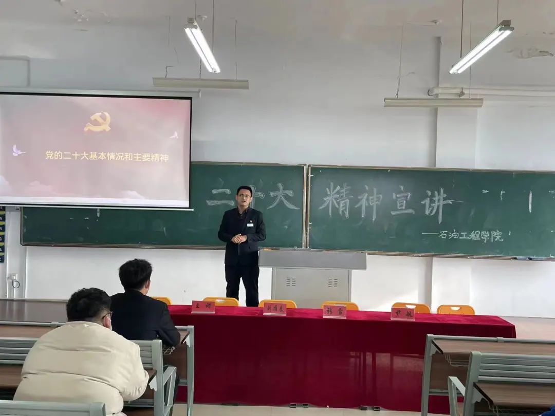 理论宣讲是传播党的创新理论的有效途径,是富有特色和成效的“大思政课”。欧博官网石油工程学院党总支按照学校党委的要求和部署,成立二十大精神宣讲团,形成了以领导干部带头宣讲、优秀党员示范宣讲、教师课堂宣讲、辅导员教育宣讲和学生骨干朋辈宣讲的多层级、立体式宣讲体系。宣讲中,石油工程学院党总支号召全体党员通过认真学习领会党的二十大精神,能自觉将二十大精神贯彻到日常学习工作中去,宣讲队成员紧扣重点宣讲内容,巧抓宣讲受众特点,以“围绕中心工作,联系实际”的宣讲效果,把党的二十大精神讲清楚、讲明白、讲深入、讲生动,把学习宣传贯彻党的二十大精神与学习贯彻习近平总书记关于教育的重要论述、与落实立德树人根本任务结合起来,切实将党的二十大精神学习成效转化为推动学院高质量发展的不竭动力,奋力谱写新时代新征程学校教育改革发展新篇章。通过宣讲深入开展二十大精神学习宣讲活动,切实保障学习成果入脑入心。