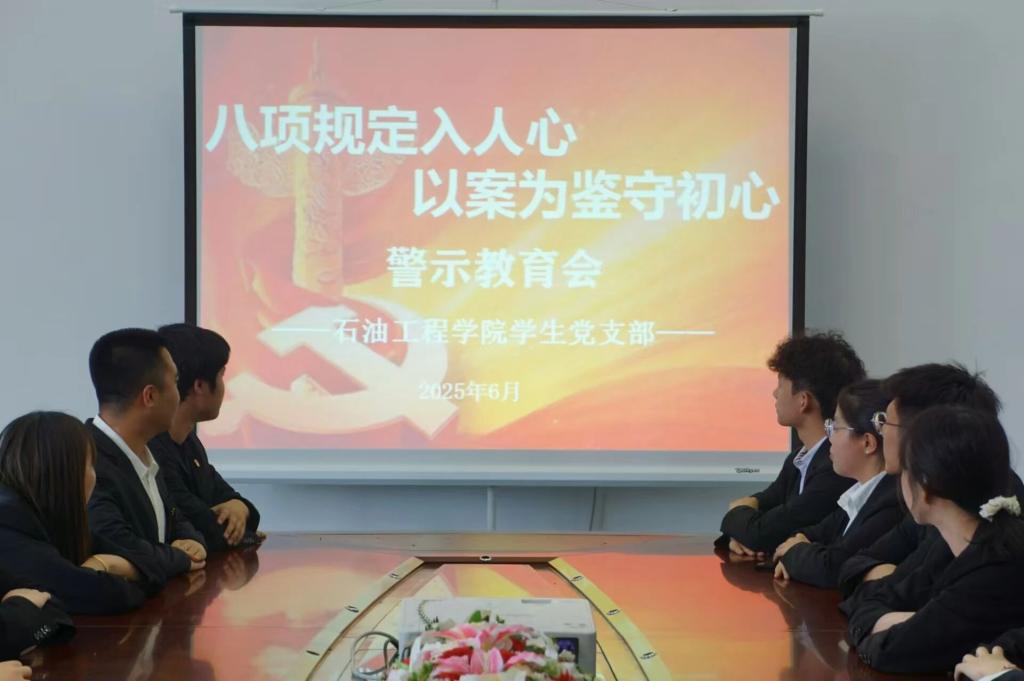 为深入贯彻落实中央八项规定精神,强化学生党员廉洁自律意识,筑牢思想防线,2025年6月25日,石油工程学院学生党支部召开“八项规定入人心 以案为鉴守初心”警示教育会。全体学生党员参与会议,会议由学生党支部书记沈欣宇主持。
