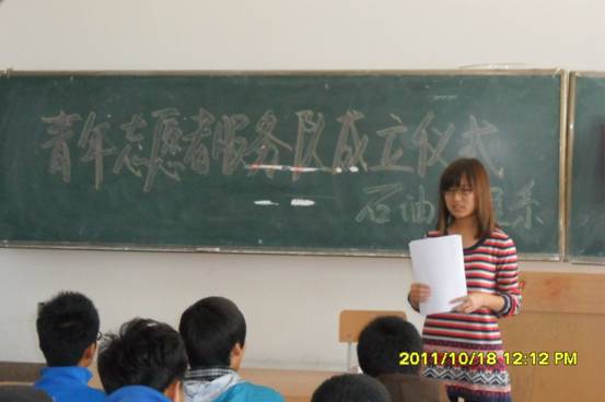 2011年10月18日。石油工程系青年志愿者服务队成立仪式在407教室举行,并在会后进行了首次活动。有70多名同学参加了服务队。作为东北石油大学华瑞学院最大系,我系在以往的各种活动中都做得有条不紊,并且都会得到学院领导的赞扬。