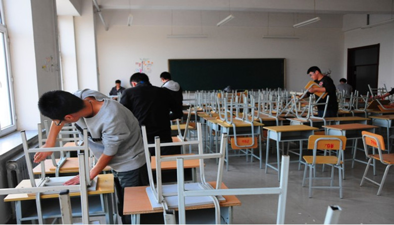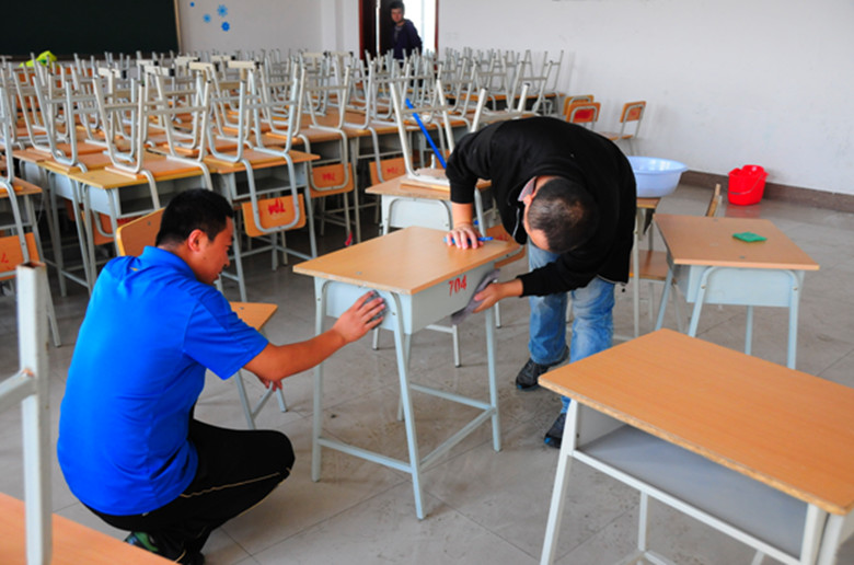 每位导员都做着被分配的任务,擦黑板的工作,清理黑板灰尘、碎粉笔头、整理黑板擦;扫地,每个桌子,凳子下面都彻底的打扫;拖地,清扫每一点灰尘,连边边角角都清理的干干净净;擦桌子,将桌子上的字迹一点一点地刷掉、桌堂里的垃圾也都被导员们一个个的清理干净擦干净;墙上面的脚印,也被一点一点的磨掉。侍书记也参与其中,不怕辛苦,给大家增加了干劲。