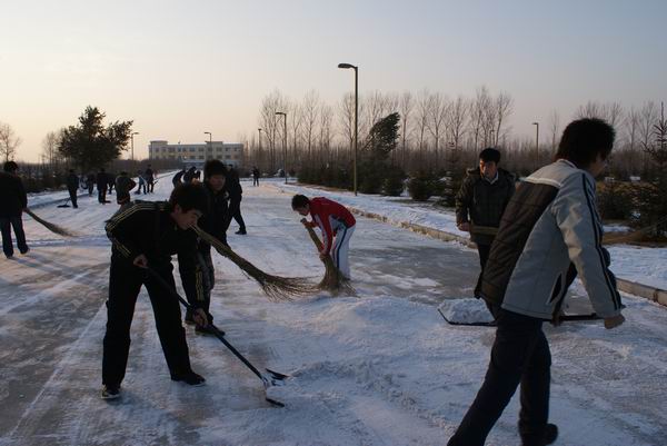 同学们把积雪清扫并集中堆放,确保了广场的道路通畅。经过3个小时的努力,积雪终于清扫完毕。在清雪过程中,全体同学发扬了不怕苦,不怕累的优良传统。