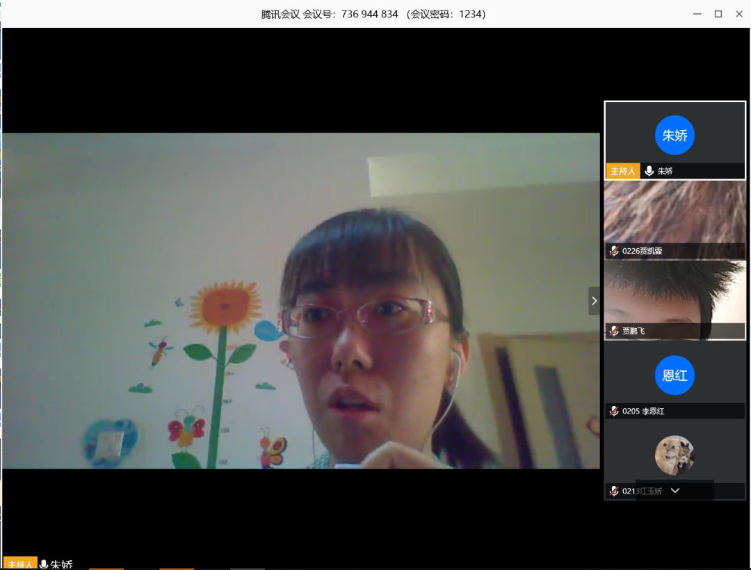 在分享疫情下的感受环节,“美食博主”杨钏同学分享了自己近一个月以来的烹饪生活:从“简单的炒菜,这样的家常菜品”学起,进而参考美食博主的视频自己探索。在她看来,在家烹饪的时光不仅促成了厨艺的提升,更是难得的一段与父母共处的时光。贾凯霖同学也分享了自己疫情下的学习感受:一开始比较担心时差调整不到正常状态,不过还好,通过多订了几个闹钟,克服了这个问题。此外的体验还是非常不错的,个人感受比起在校的教学,反而更有效率,能够集中注意力,因为老师的声音一直就在耳边,所以更容易听进去了。朱娇老师也表示非常期待与大家在校园的早日相聚!