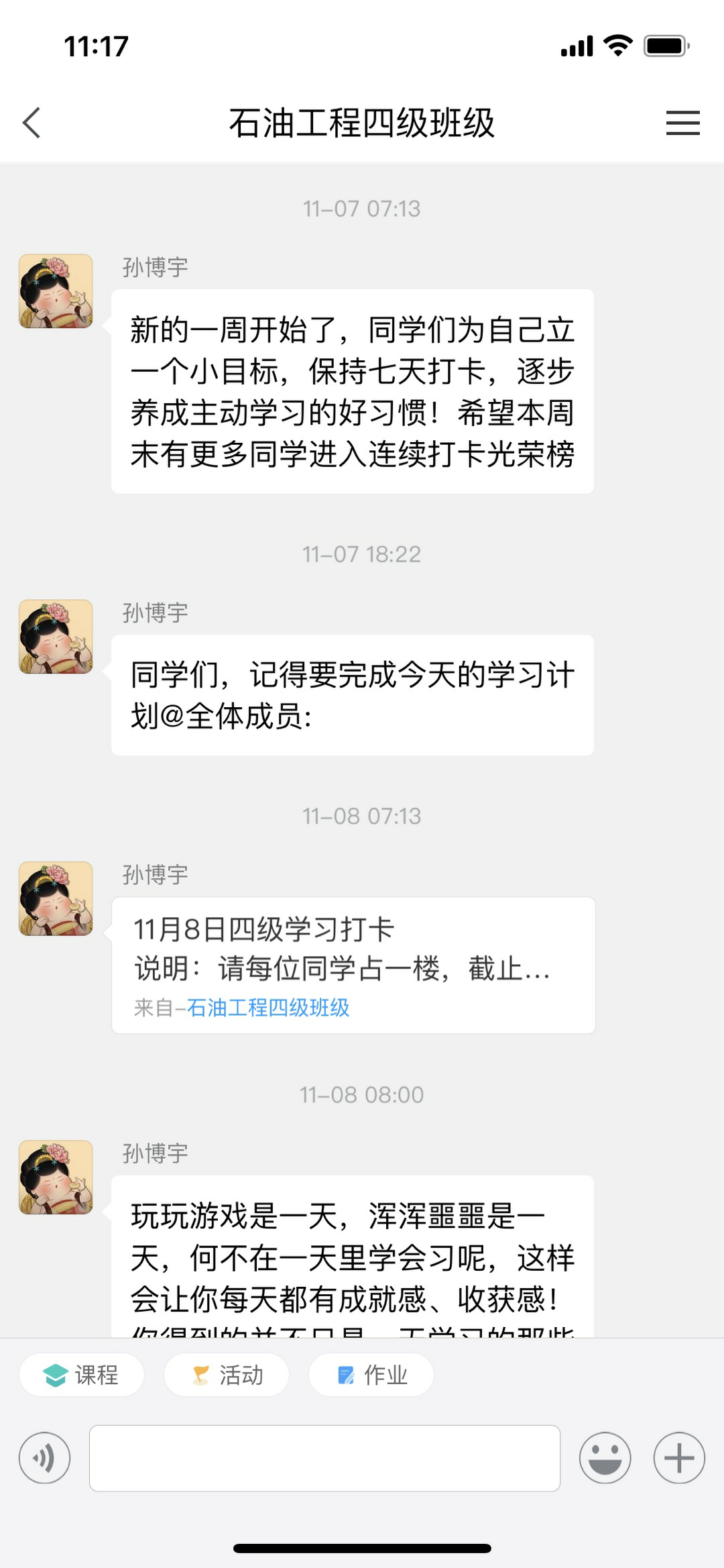 该活动目前已进行四周,本月带班教师孙博宇、张国芳、夏长元、郑洲认真负责,采取多种形式鼓励和督促班级学生,有效改善了四级班学生的学习习惯。对不能按时完成学习任务的同学以各种形式帮助其坚持学习;对长时间不能按时参加学习活动的同学,系内采取了公告和部分人员流动等措施。
