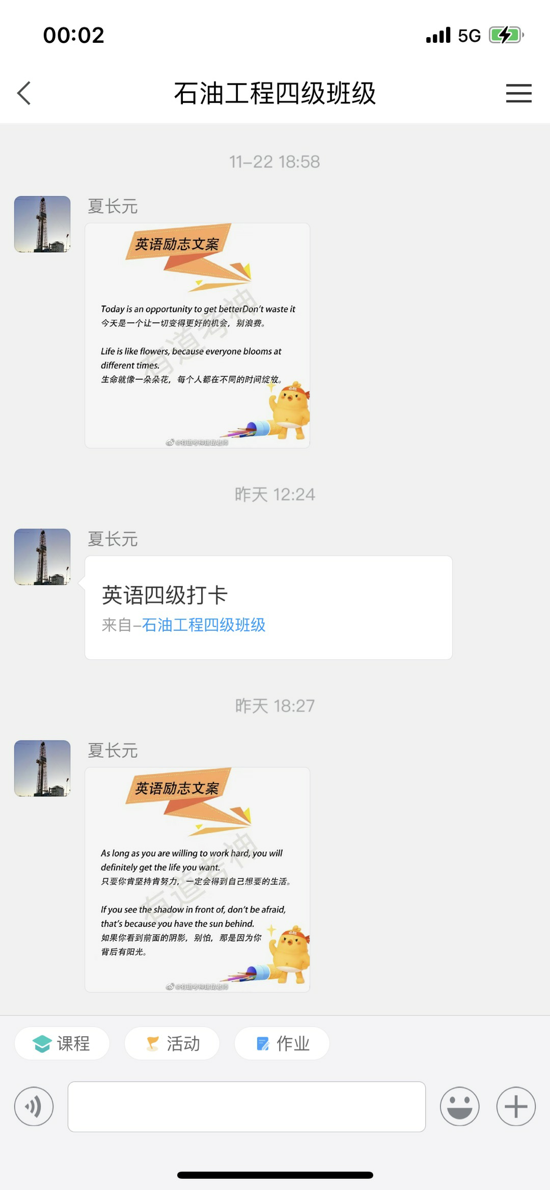 为更好学习贯彻党的二十大精神,落实以学生为中心的教育理念。从激发学生学习英语兴趣、增强学生学习英语信心、使学生充分备战国家四六级英语考试等角度出发,自10月底,石油工程系按照学院安排成立了英语四级学习班。该学习班由叶雪、李井洋老师为学生制定专门的四六级学习计划,学生自愿报名参加,各级辅导员老师宣传并成立班级,石油工程系教师负责监督指导,利用APP进行线上统一管理的形式进行。班级学生需按时完成学习计划中的学习任务,并在学习完毕后及时线上打卡;每周委派一名教师负责班级监督与管理总结工作,并随时为学生解答学习英语和备战四六级考试过程中的各种问题。