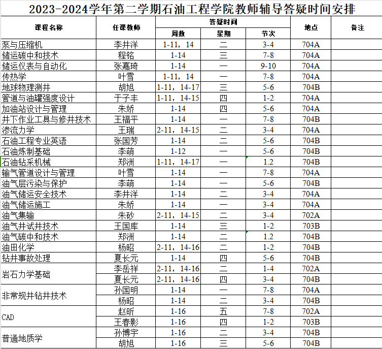 为巩固课堂教学效果、提高教学质量,保证课外辅导答疑的到位、有效,现向全院公布本学期任课教师的固定辅导答疑时间与地点,详见附件《2023-2024学年第二学期石油工程学院教师辅导答疑时间安排表》。