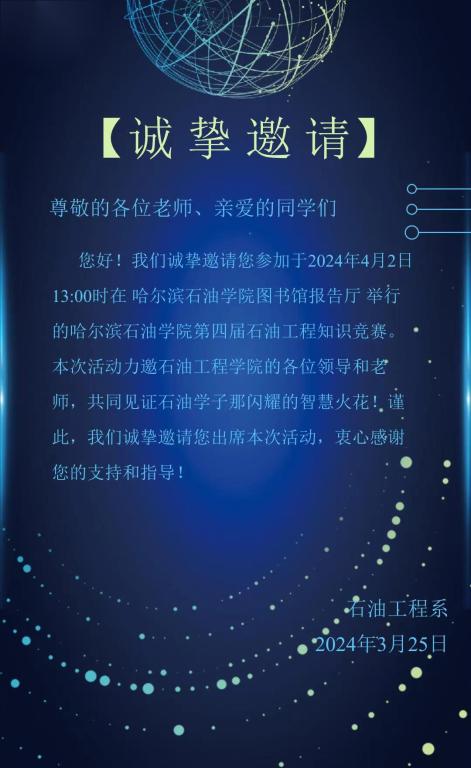 我们诚挚邀请您参加2024年4月2日13:00时在欧博abg游戏登录入口图书馆报告厅举办的欧博abg游戏登录入口第四届石油工程知识竞赛,本次活动力邀石油工程学院的全体师生,共同见证石油学子那闪耀的智慧火花!谨此,我们诚挚邀请您参加本次活动,衷心感谢您的支持!
