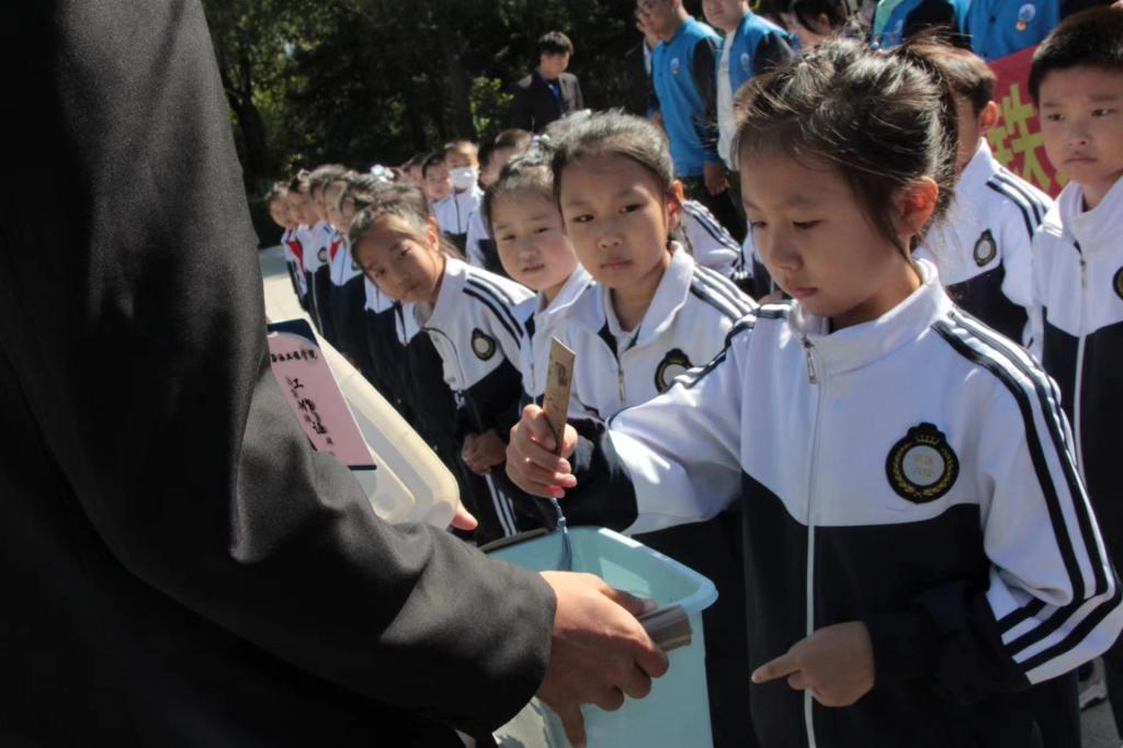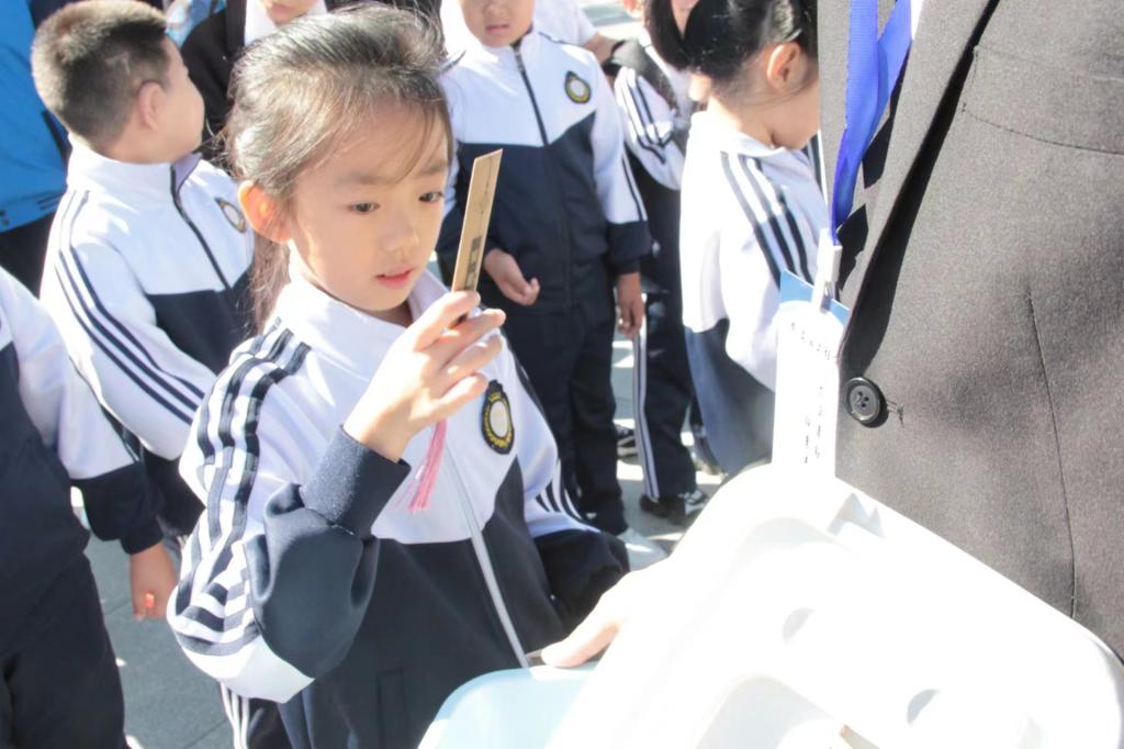 我院志愿者为第六新区学校学生代表发放本次活动的纪念品。