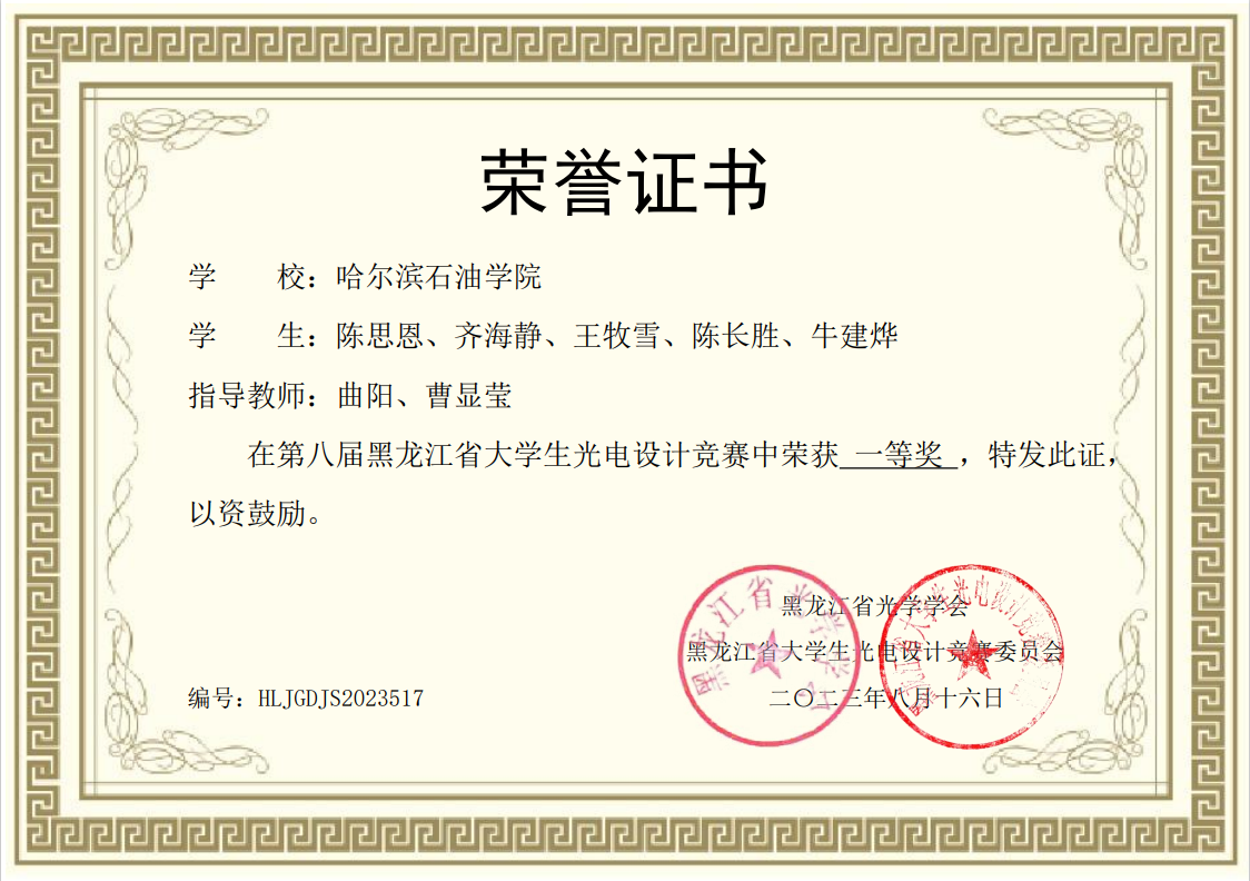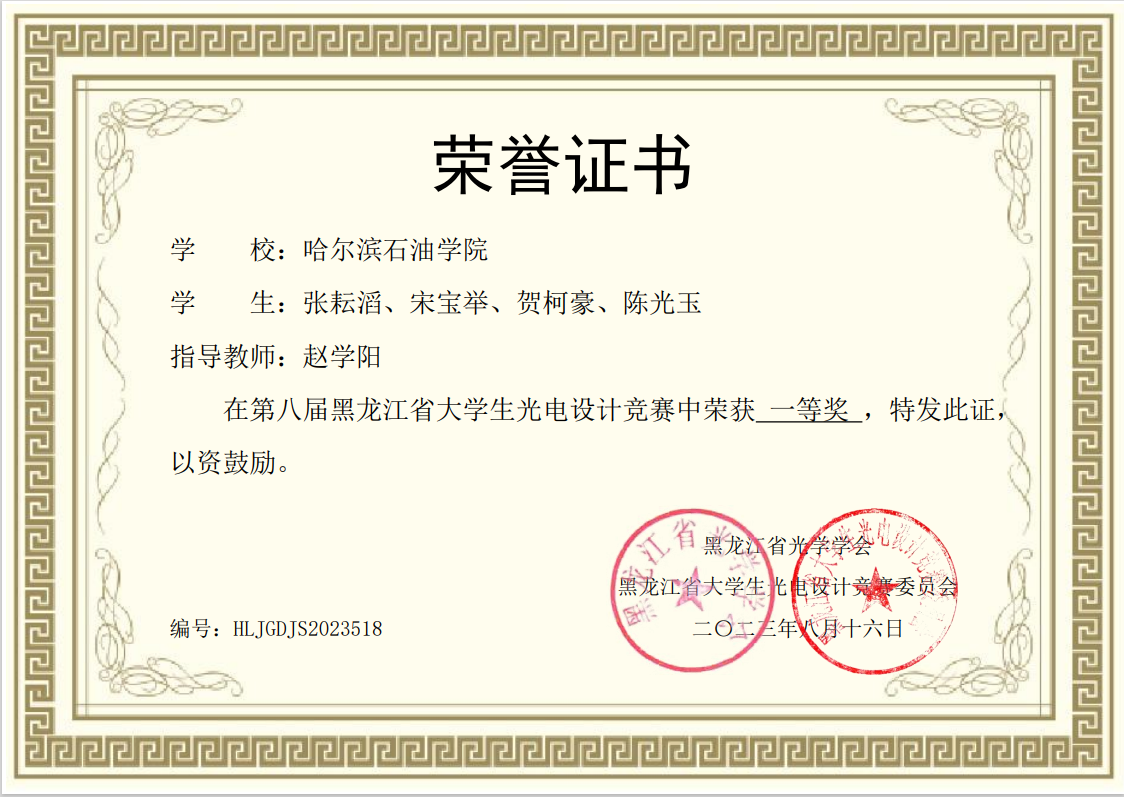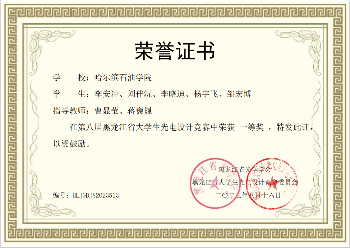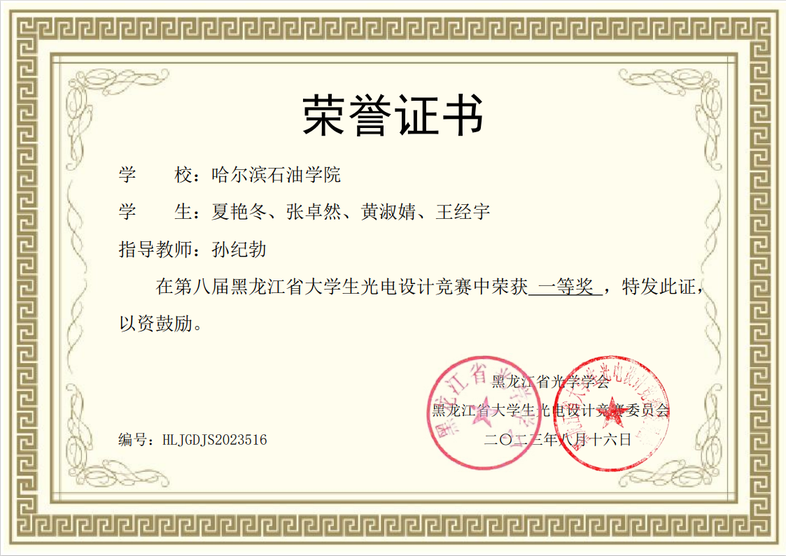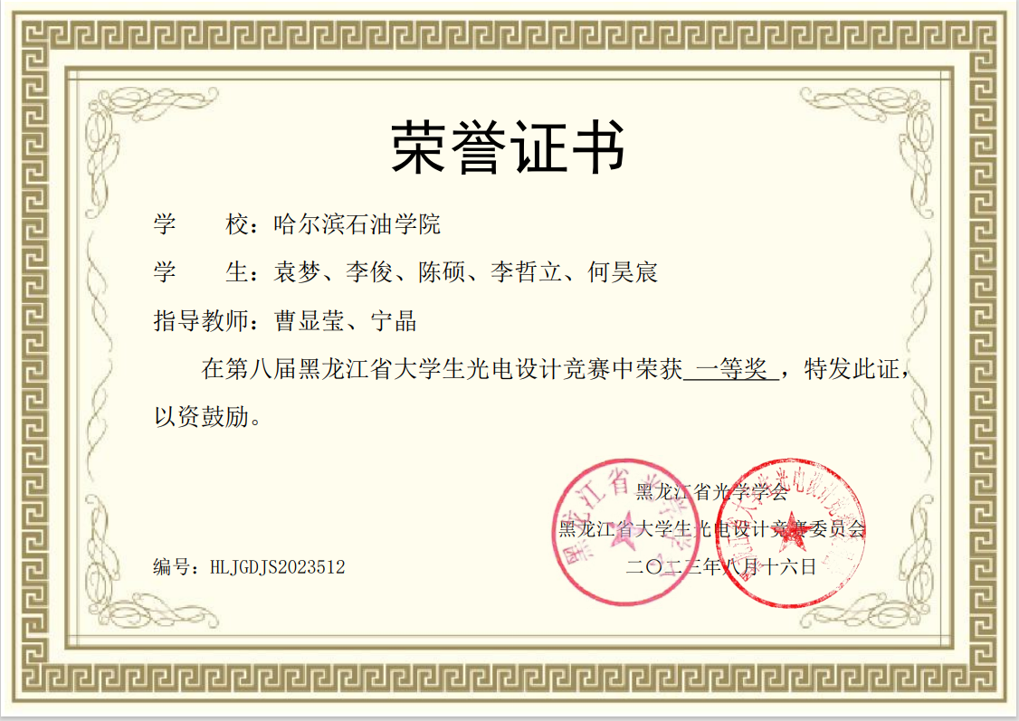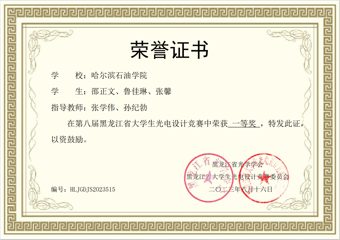 2023年第八届黑龙江省大学生光电设计竞赛荣获一等奖名单