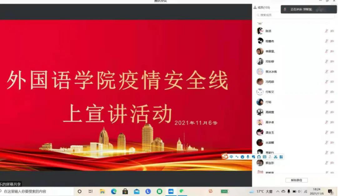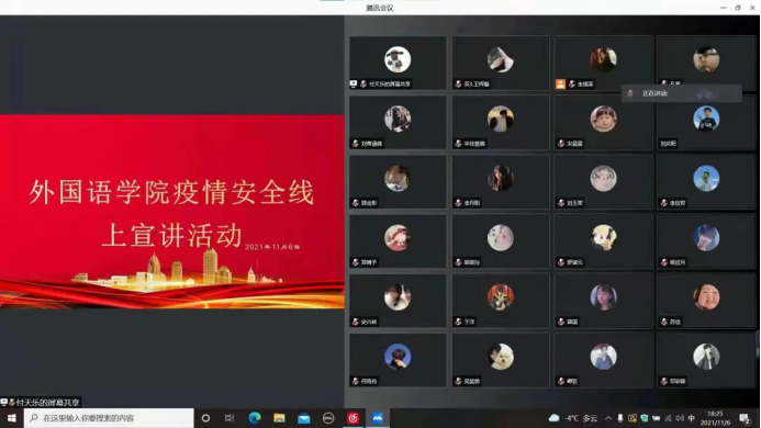 根据学校疫情防控工作的相关要求,为切实做好外国语学院的疫情防控工作,进一步提高外国语学院疫情常态化防控的主动性,外国语学院于11月6日线上开展了疫情安全宣讲活动。