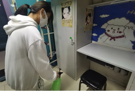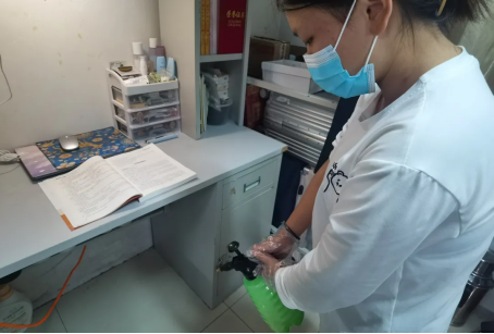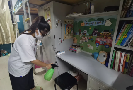 在消杀过程中,学生党员们严格按照卫生消毒管理的标准规范,手握喷壶,佩戴口罩、手套等对各个寝室逐一进行了全面细致的消杀作业,确保不留死角,全方位覆盖,保证寝室的每一处地方都得到了有效的卫生消杀,并对寝室进行通风,保证空气流通。在党员志愿者进行消杀工作时,同学们也积极进行配合,给工作人员留出足够的空间,更加迅速地完成消杀任务。
