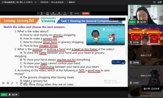 本次检查以青年教师和外聘教师为主,重点检查教师的教学准备情况(包括电子课件质量、平台及软件操作熟练度等)、课堂教学设计水平(包括教学目标、教学步骤、教学语言等)和课堂管理能力(包括学生互动数量、互动质量、课堂活动形式、师生是否打开摄像头互动等)。