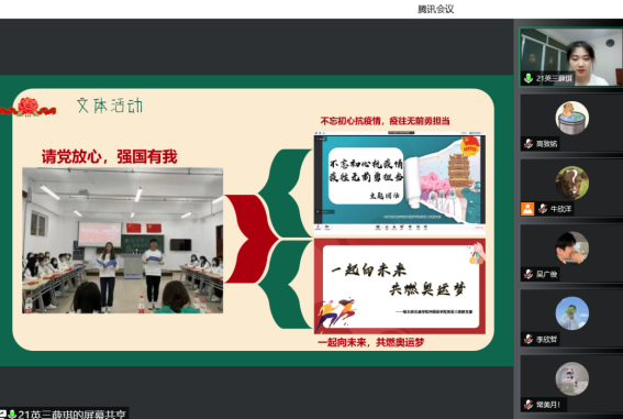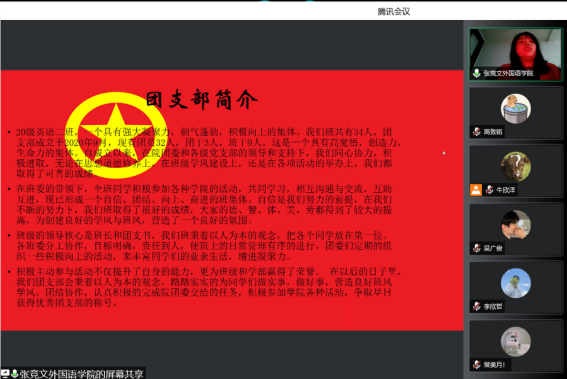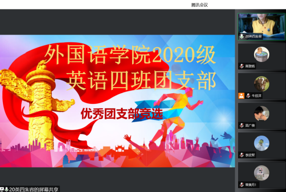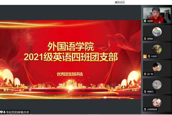 为纪念五四运动103周年,表彰先进,树立典型,鼓舞和激励广大共青团员发奋学习,努力工作,更为进一步调动基层团组织工作的积极性、主动性和创造性,外国语学院响应学校号召于4月8日下午在腾讯会议召开了“共青团2021—2022学年度先进团支部”评选会。此次会议由欧博abg游戏登录入口外国语学院党总支副书记孙晓萍、外国语学院团总支书记赵连琦、郑智慧担任评委,外国语学院团总支副书记牛欣洋同学主持此次会议。