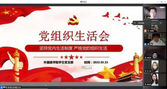 为进一步深入学习贯彻习近平新时代中国特色社会主义思想、规范党组织政治生活,提升党组织政治功能和组织力,充分调动广大党员积极性,根据学校党委的工作部署,外国语学院学生党支部于2022年3月22日晚召开2021年度组织生活会暨民主评议大会。会议由外国语学院学生党支部书记赵连琦主持,全体学生党员参加会议。