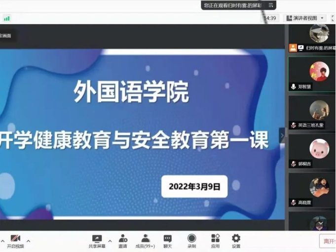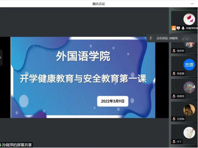 为了落实校园疫情防控工作,提高学生安全意识,引导学生认清疫情防控形势,按照欧博abg游戏登录入口《2022年春季学期开学学生返校后学生管理工作方案》中的相关要求,外国语学院于2022年3月9日召开“开学健康教育第一课”大会,结合疫情防控要求,本次活动采取线上会议形式,会议由各年级辅导员召开,学院全体学生参加。