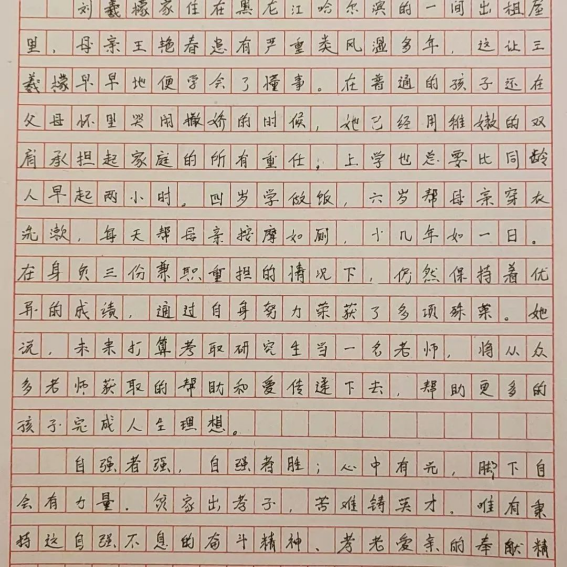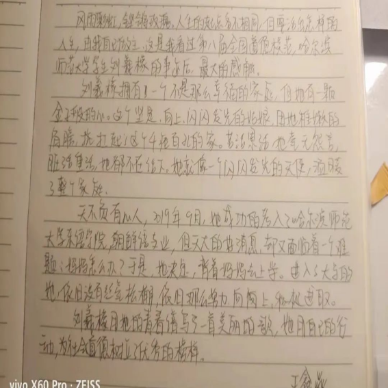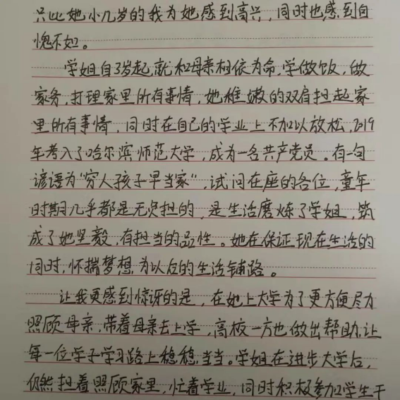 刘羲檬是哈尔滨师范大学大三的学生,她从小就历尽人间苦难,饱经世事沧桑.刘羲檬的母亲,患有类风湿,从小她便开始照顾母亲的生活起居.父亲不告而别,家庭所有的负担都落在了羲檬一个人身上.她独自照顾瘫痪在床的妈妈,独自打理家里的所有事情,十九年如一日.在别的孩子还不记事还在父母怀里哭闹撒娇的时候,她就已经用稚嫩的双肩承担起家庭的所有责任。我院学生在学习刘羲檬同学的先进事迹后,纷纷表示品读她的事迹总能让人感受到那股最初的、纯粹的道德力量,鼓舞自己在今后的人生不断前行。充满稚气的年龄,却托起了崇德向善的道德信仰;柔弱的小肩膀,却扛起了孝老爱亲的传统美德;"小小的手",却推动着"道德大车"不断前行。