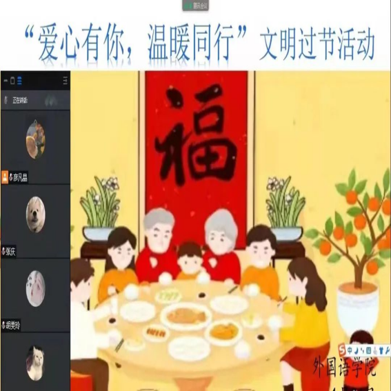 春节将至,疫情当前。为积极响应要求,遵守相关规定,保持良好卫生习惯和健康生活方式,加强健康防护。外国语学院于2022年1月26日在线上开展了“爱心有你,温暖同行”文明过节活动。
