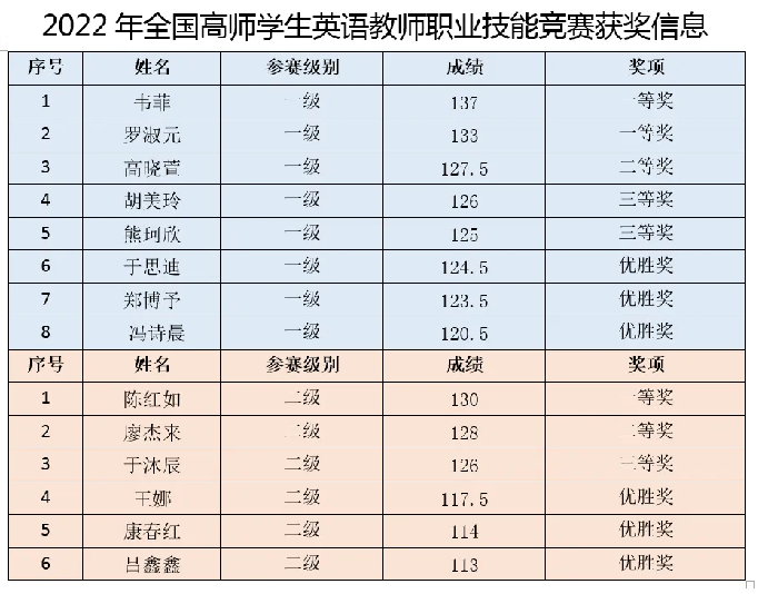 2022年全国高师学生英语教师职业技能竞赛已经画上圆满的句号,欧博官网学生韦菲和罗淑元获得一级一等奖,陈红如获得二级一等奖。