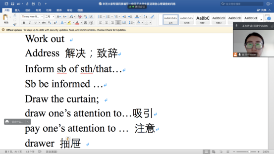 郑老师首先以提问形式复习上节课知识点,然后指出本节课主要学习内容和重难点,PPT内容充实。课程讲解中,教师和学生互动较好,提问形式多样,有主动回答,抢答,教学APP随机抽选,老师提问等形式,保证学生上课的最佳状态,有效地提升学生的学习积极性。同时,整个课程中,教师全程开摄像头,尽力保持线下课的教与学的效果,为保证网络通畅,回答问题的同学主动打开摄像头,有助于教师组织教学。整堂教学中,师生配合较好,有利于大一学生基础知识的积累,为英语四六级考试打下夯实的基础。