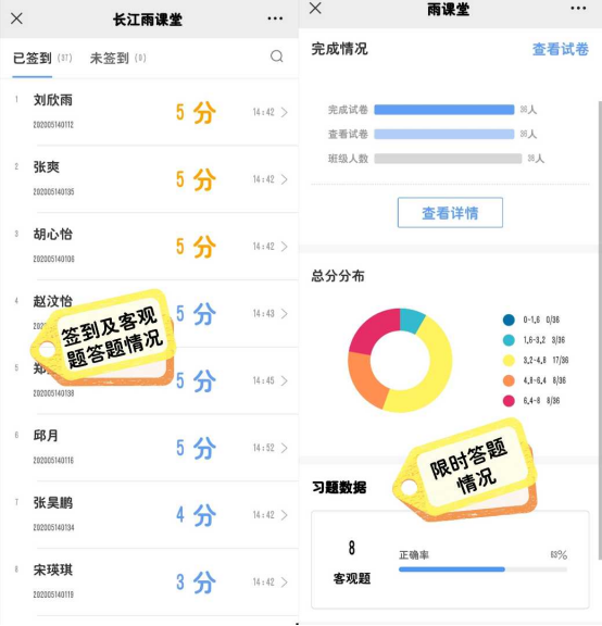 雨课堂反馈学习状态数据,及时掌握学生课堂表现。课堂上为了及时了解学生听课状态,在授课过程中会适时关注弹幕和评论区里学生留言,及时解答学生问题,课上连麦、提问等环节,增强师生互动,为了检验学生的听课效果以及知识掌握情况,每堂课都会发布雨课堂练习,如词汇练习、单句及段落翻译及作文等。题型设定可选择,主观题、客观题、投票等类型多样化。也可批量导入题量稍大些的客观题作为随堂练习或测试。雨课堂会及时把课堂数据进行反馈,会根据学生课堂表现,列出优秀学生和“预警”学生名单,让教师及时掌握学生学习状态。