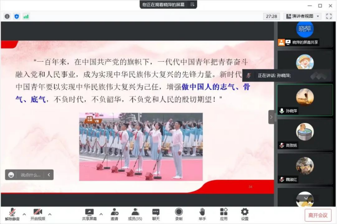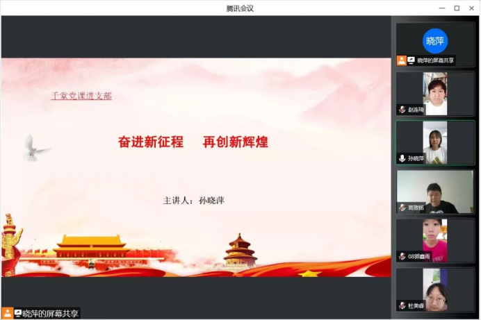 党总支书记孙晓萍在会上侧重讲解了作为青年大学生,应如何践行请党放心,强国有我的誓言。首先,要铭记苦难辉煌,坚定信仰主心骨,做有志气的奋斗者;其次,应强化使命担当,练就成长硬本领,做有骨气的开拓者;最后,她希望全体学生党员能够不辱使命,不负韶华,奋进新征程,再创新辉煌!