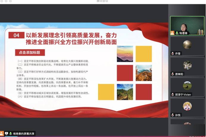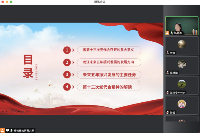 会上,杨艳春书记带领大家解读了黑龙江省第十三次党代会精神,学习了大会的主题和意义。她强调,作为高校教师,要学深悟透省第十三次党代会精神,在“能力作风建设年”活动中提升学习能力,结合日常工作的实际,进一步解放思想,发挥党员的先进性,将创新的思想运用到平时工作中,以更加昂扬的斗志、更加进取的精神、更加务实的作风奋进新征程,再创新辉煌!