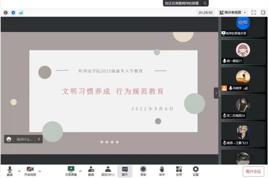 为了推进学校的素质教育,提升同学们的综合素养,帮助同学们养成健康文明的生活习惯,争做新一代文明大学生,外国语学院开展2022级新生文明习惯养成行为规范教育,由党总支书记孙晓萍主持召开,22级全体新生参与。
