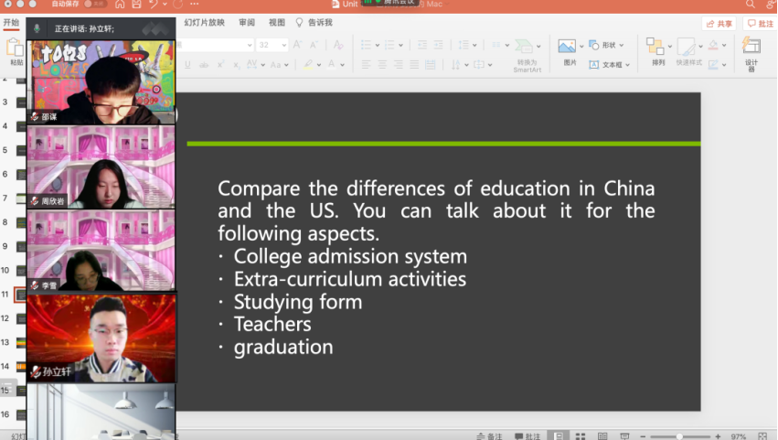在教师教学材料准备方面,为了激发学生的学习兴趣,教师紧跟时代步伐,根据每节课不同的话题和当今时政,整合出相应的视频、音频,并制作成教学课件,在全民抗疫背景下,课程多次选用疫情防控相关的主题,在教学内容上,也有所侧重,旨在激发学生的学习兴趣,拓宽国际化视角,培养家国情怀。