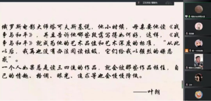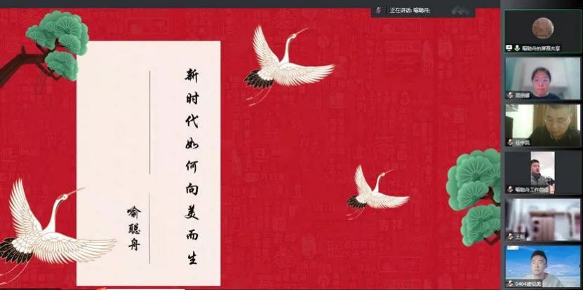 最后,王莉娅院长代表全院师生向喻博士表示感谢,并号召全体学生能够在讲座后继续思考美学的内涵,以喻博士的讲座为指引,坚持读书,提高文学艺术和美学鉴赏水平,在生活中实践“向美而生”的理念。整场讲座精彩绝伦,主讲人和学生亲切交流,在疫情的特殊背景下,为学生们带来了一场信息丰富、意趣高雅的精神盛宴。