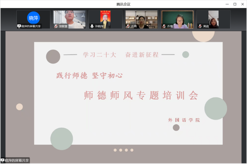 为认真学习贯彻党的二十大精神,引导全体教师坚定理想信念、涵养高尚师德,规范执教行为。11月7日,外国语学院召开“践行师德 坚守初心”师德师风专题培训会。外国语学院全体教师参加会议。