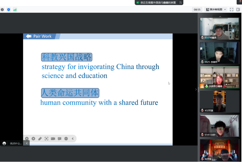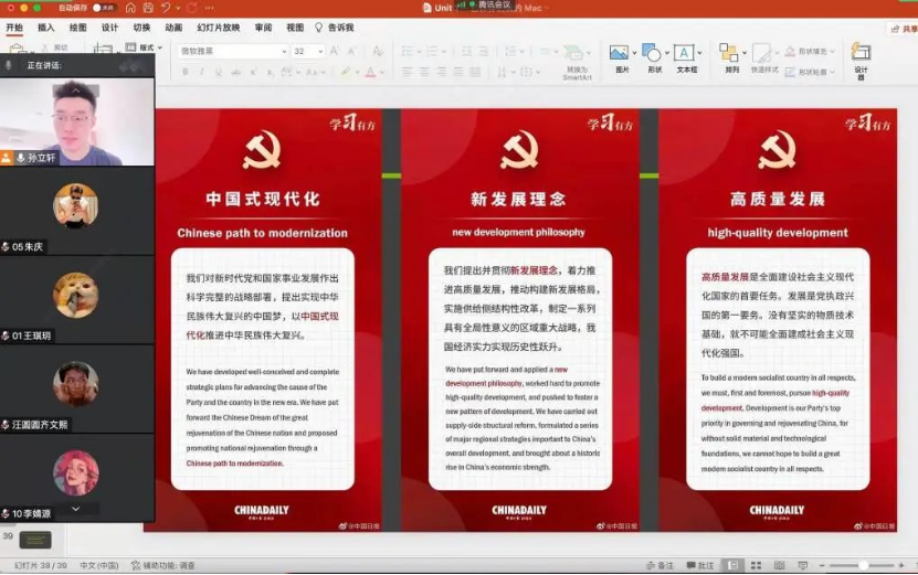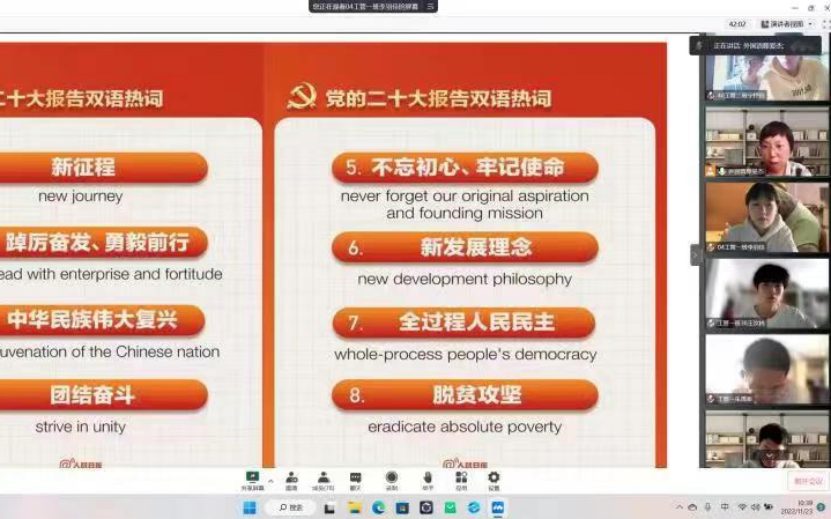 “中国式现代化”、“新发展理念”“人民立场”、“文化自信自强”……这些党的二十大报告中的热词用英语、俄语怎么讲?外国语学院教师发挥特长、立足岗位用实际行动讲好中国故事,传播好中国声音,展示好中国形象,增强文化自信,让中国共产党治国理政的理念传播更广推动中华文化更好走向世界。专业教师在教学设计中巧妙地将党的二十大报告双语金句热词作为教学内容,将最新理论成果运用到课堂教学当中,积极探索具有专业特色浸润式思政教育新模式,把思政课讲深、讲透、讲活。同学们纷纷表示,党的二十大报告金句热词双语权威准确表达对照探讨非常有兴趣、有意义,既学习了党的二十大精神,同时结合专业特点又提升了外语表达与翻译能力,课后还会持续探究学习。