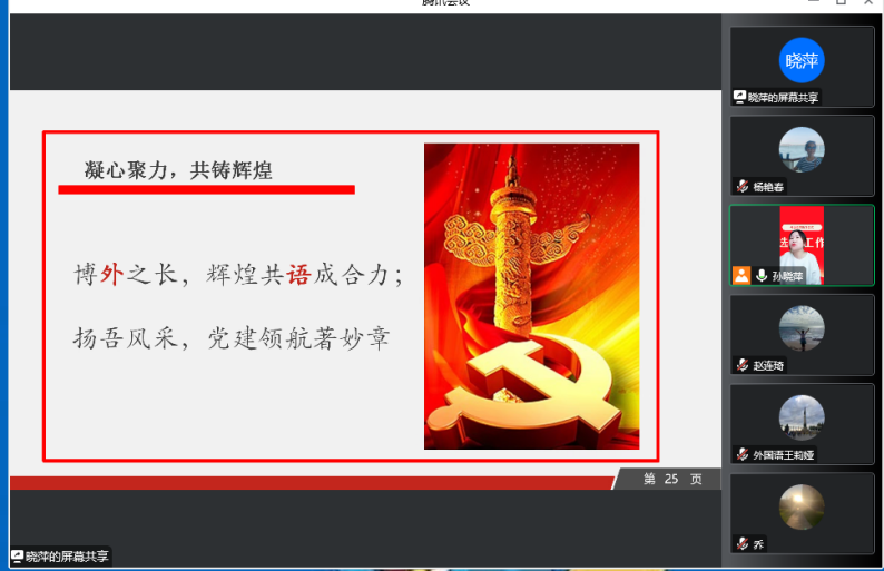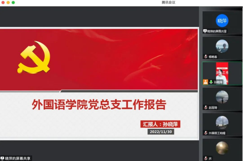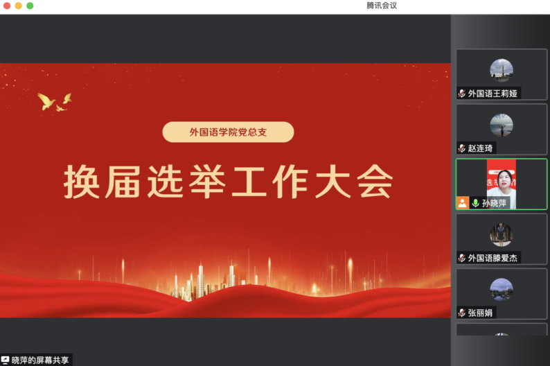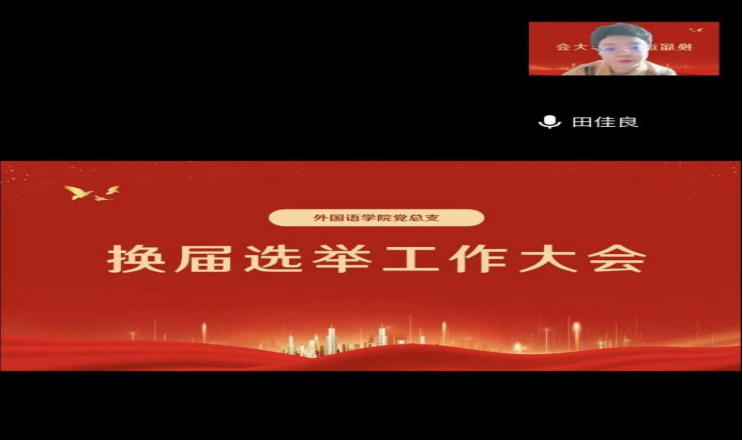 根据《中国共产党章程》《中国共产党基层组织选举工作条例》《中国共产党普通高等学校基层组织工作条例》和学校党委的有关规定,中共欧博abg游戏登录入口外国语学院党总支委员会换届选举大会,于11月30日通过线上召开,选举产生新一届党总支委员会委员。大会由外国语学院党总支书记孙晓萍同志主持,外国语学院全体党员参会。