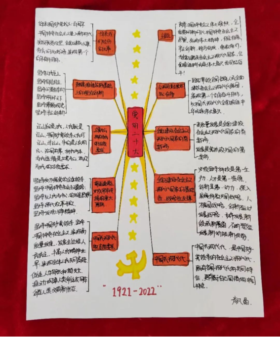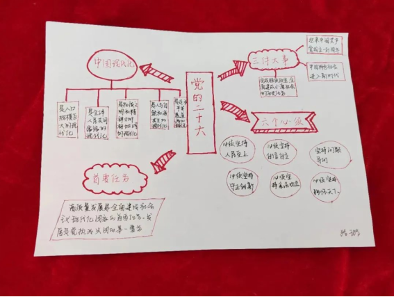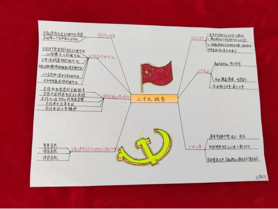我院学生党员认真学习党的二十大报告,积极参与投稿,精心绘制思维导图。与常见的文字报告相比,思维导图能更直观地展现思维过程,加深对党的二十大精神的感悟,进而确保同学们看得懂、记得住,让党的二十大报告学习深入人心。