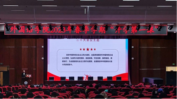 为深入贯彻党的二十大精神,喜迎新学期的到来,进一步凝聚青春力量、感恩接续奋斗,3月14日外国语学院在图书馆汇报厅举行了2023年春季开学第一课。本次开学第一课由外国语学院党总支书记孙晓萍主讲,学院院长王莉娅、学团办公室主任赵连琦、辅导员郑智慧和全院全体学生共同参加了此次活动。
