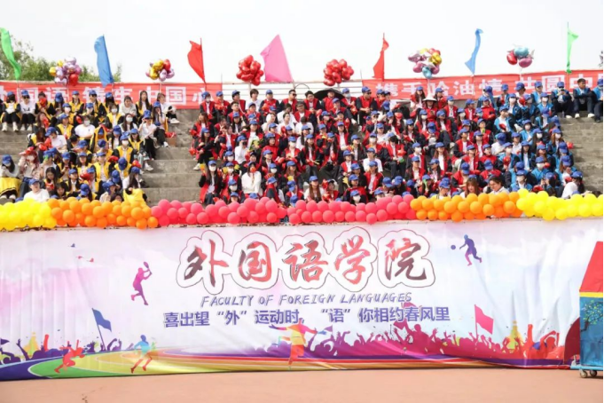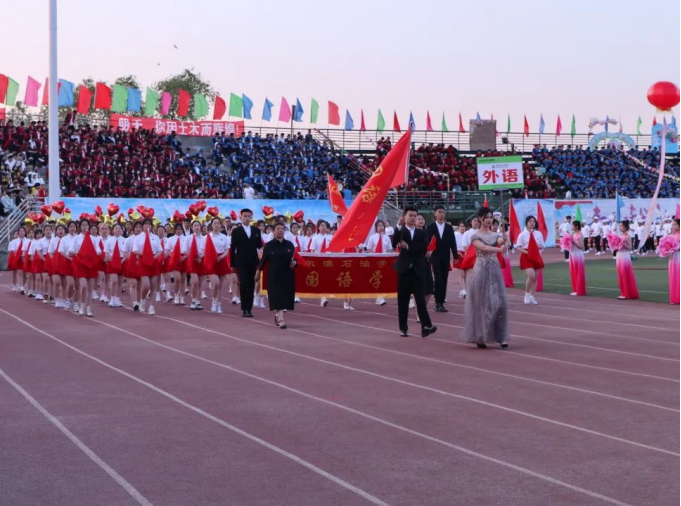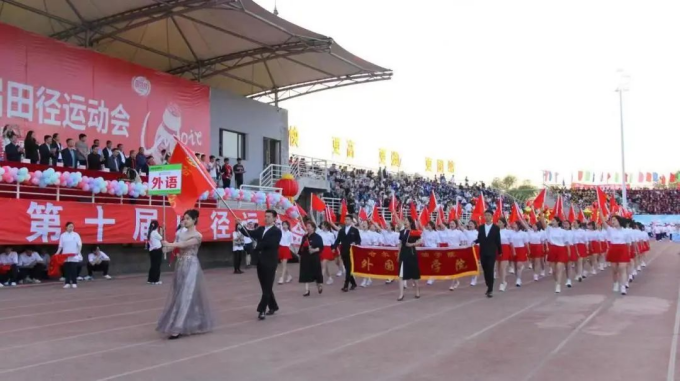 如诗五月,万物舒展,青春气息随风而至,热血与阳光撞了个满怀,伴随着夕阳,同学们整装待发,随着一声令下,外国语学院代表队的同学们昂首阔步而行。“说好外国语 铸牢中国心 携手哈油情 共圆中国梦”,我院嘹亮的口号激荡赛场,旗子在空中飘扬、与风共舞。同学们以蓬勃向上的朝气走过主席台前,伴随着“加油歌”歌声响起,整齐的舞蹈深深感染着台上的每一位观众。