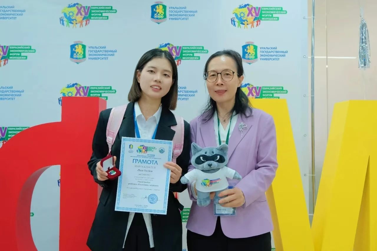 2025年4月22日,第十五届欧亚青年经济论坛(EEFM)在俄罗斯叶卡捷琳堡市国际展览中心盛大开幕。在备受瞩目的国际英语征文竞赛中,我院英语专业2022级一班学生周玉珍凭借其极具深度的学术文章《斯大林格勒战役:历史正义与记忆重构的全球启示》,在来自中俄及欧亚多国的千余名青年精英中崭露头角,一举荣膺中国区第一名!校长王义宁教授受邀出席论坛并亲自为周玉珍颁发冠军证书。这一优异成绩的取得,不仅是周玉珍同学个人学术实力的精彩展现,更是外国语学院在国际化人才培养方面的又一重大突破。