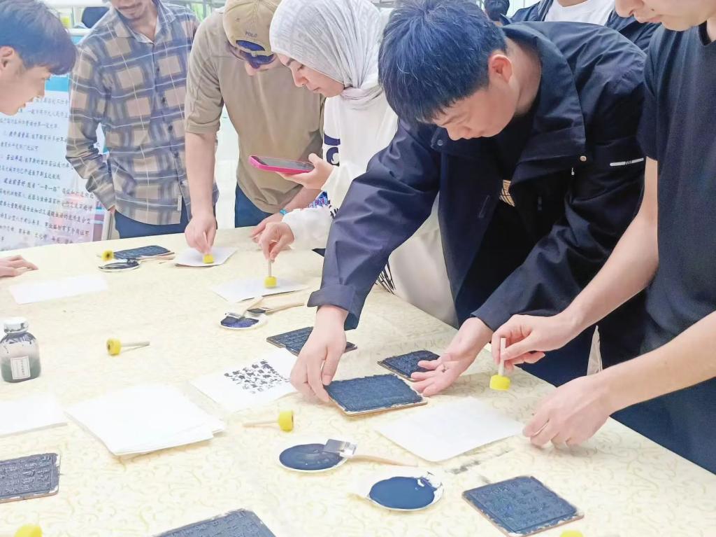 传统文化体验区成为中外师生互动的鲜活课堂。在铁人精神展示区,纪录片与知识问答带师生回溯石油人奋斗史;活字印刷体验中,学生亲手制作“石油魂”主题书签,感悟传统技艺与现代叙事的融合;多语种书签制作区,中国学生传授书法技巧,“北大仓”等地域文化关键词以英、俄等文字与水墨笔触相映成趣。手工剪纸融入俄罗斯套娃元素,手绘曼陀罗创作兼具艺术疗愈与文化寓意,六大体验项目构建起“黑土精神为魂、国际表达为翼”的文化交融场域。