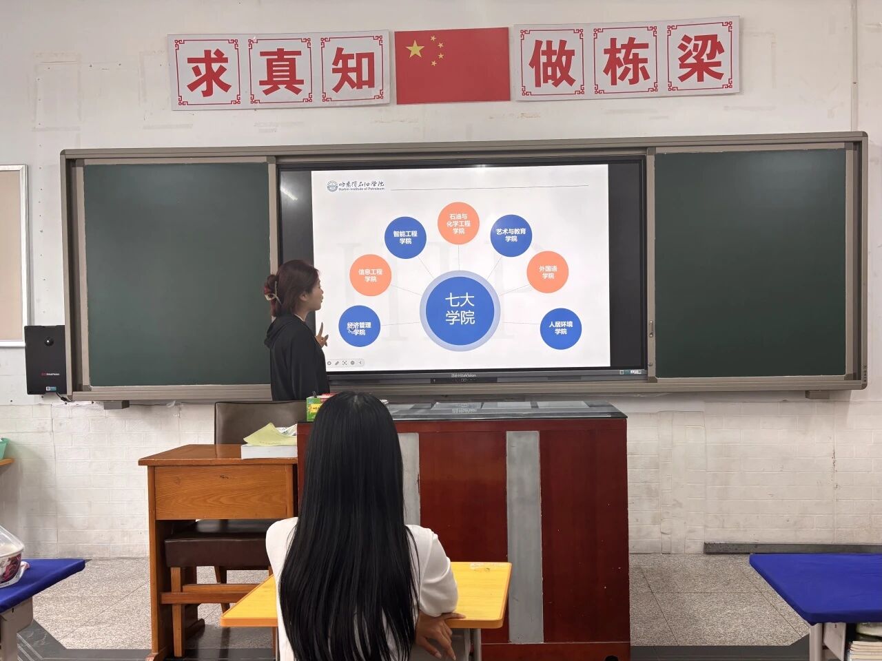宣传过程中,学生代表们既结合外国语学院特色,重点介绍英语、俄语两大专业的培养体系与43%高级职称占比的雄厚师资力量,更围绕学校层面的发展成果展开分享:详细讲解学校近年在学科建设上的突破,如新增的跨境电商、国际教育合作等特色方向;介绍校园硬件升级,包括数字化语言实验室、国际交流中心等教学设施的完善;提及学校在产学研融合上的进展,如与多家外贸企业共建实践平台、引入行业导师参与课程教学等。同时,他们通过自身参与“外研社杯”竞赛、国际交换项目的经历,生动展示学院在创新实践与国际交流方面的优势,还分享了学校15处校外实习基地带来的实践资源与高达96%的毕业生就业率等关键信息。针对学弟学妹关心的志愿填报、专业选择等问题,学生代表们以朋辈视角答疑解惑,传递实用备考经验。